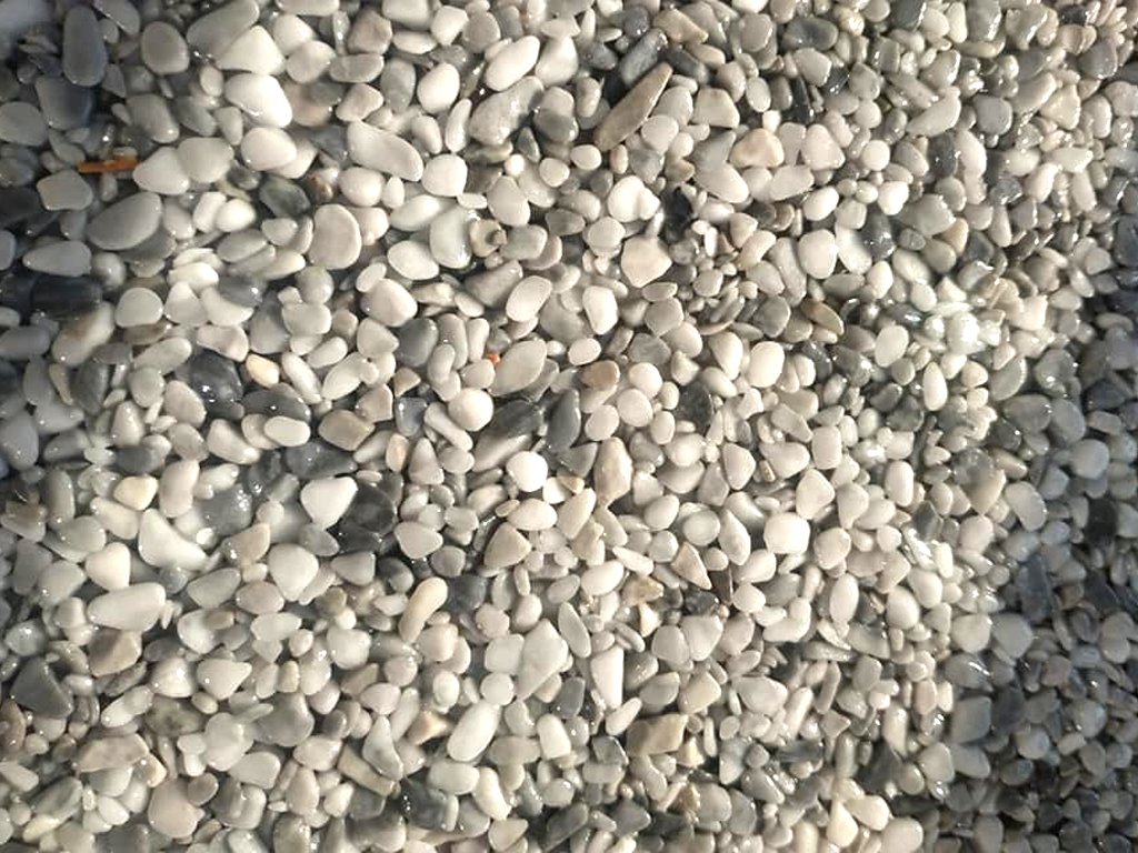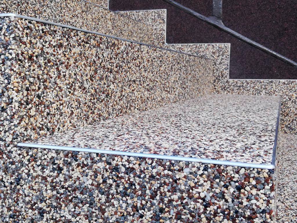 Směs kamínků a pojiva - jednosložkové polyuretanové pryskyřice s přísadou TIXO. Velikost frakce pro interiér 2-4 mm, pro exteriér mohou být hrubší, nejčastěji 4-8 mm.